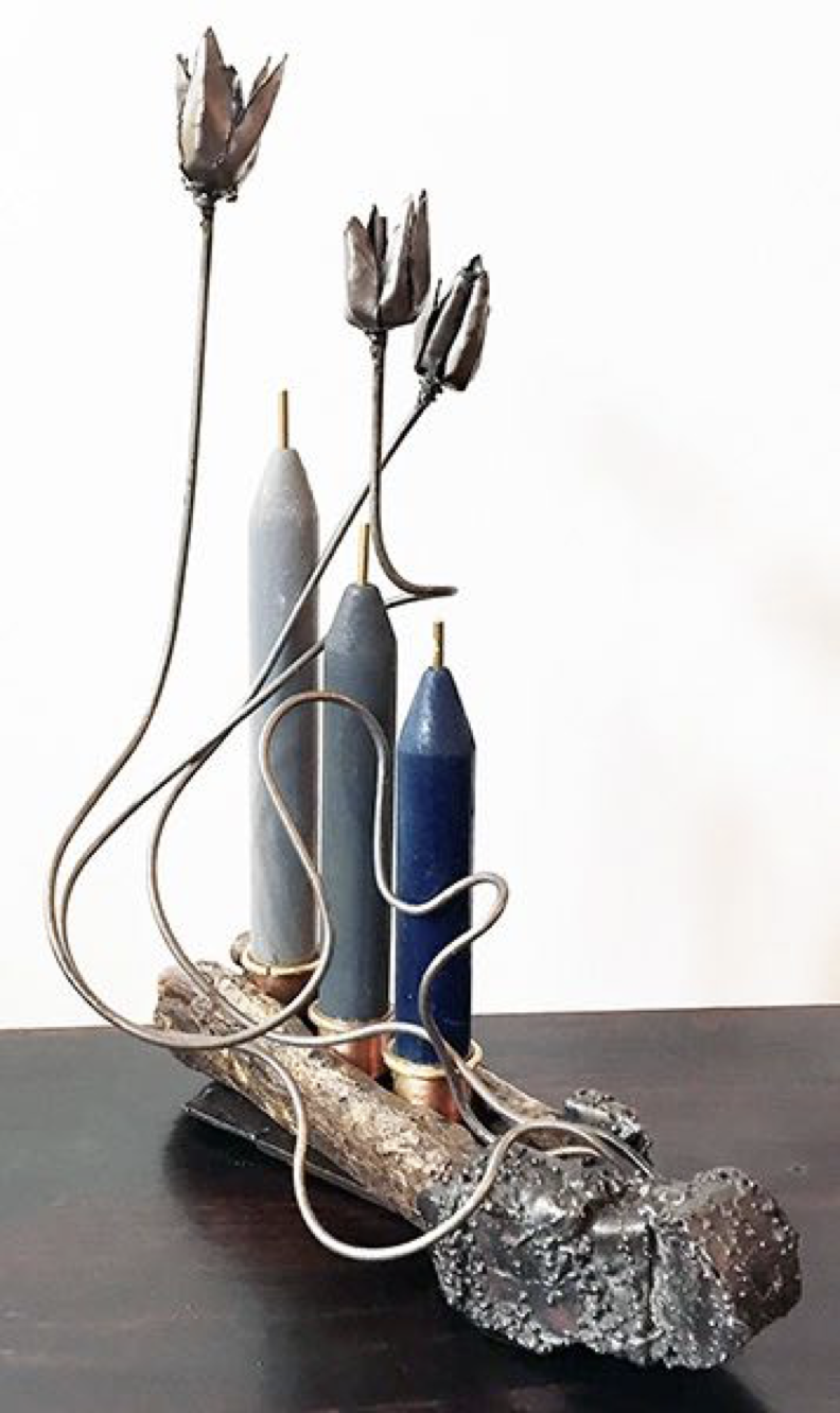 In the Candlestick Series I transform a mundane everyday object, the candlestick, into sculpture. Some in this series are fully sculptural entities in which the candle itself is painted wood with a metal wick. Some are functional. All have elements incorporated from my other sculptural work in which clearly man-made constructs interact with organic forms.