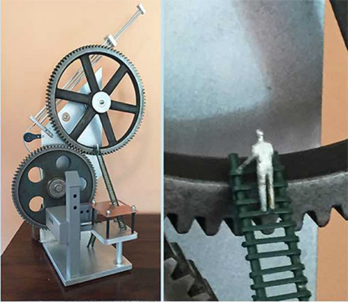 "Modern Times." 2019. Welded steel, machined aluminum and copper, gears, machine parts, steel rope and figurine. (29x15,5x17). Inspired by Chaplin's 1936 film. Private collection.
