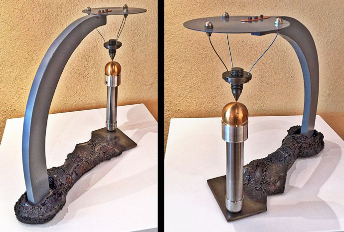 Machine No. 14. “Fraying Infrastructure” 2016. Welded, surface-treated steel, machined aluminum, machine parts, steel rope, glass beads and cast-resin ‘pond’. (26x24.5x11).