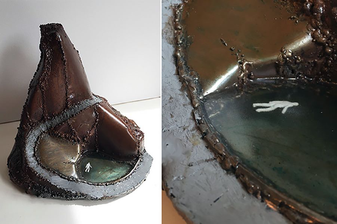 Landscape. No. 2. 2017. Welded, surface-treated steel and cast-resin “pond” with sunken figurine. (11.5x12.5x12).